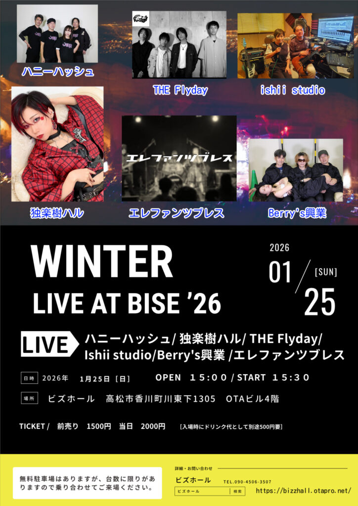 2025年12月2日 / 最終更新日時 : 2026年1月26日 Bisehall_staff6600 イベント イベント終了しました 2026年1月25日(日)LIVE at BISE 15:00開場 15:30開演 取り置き1500円 当日2000円 (入場時ドリンク代500円別途要)